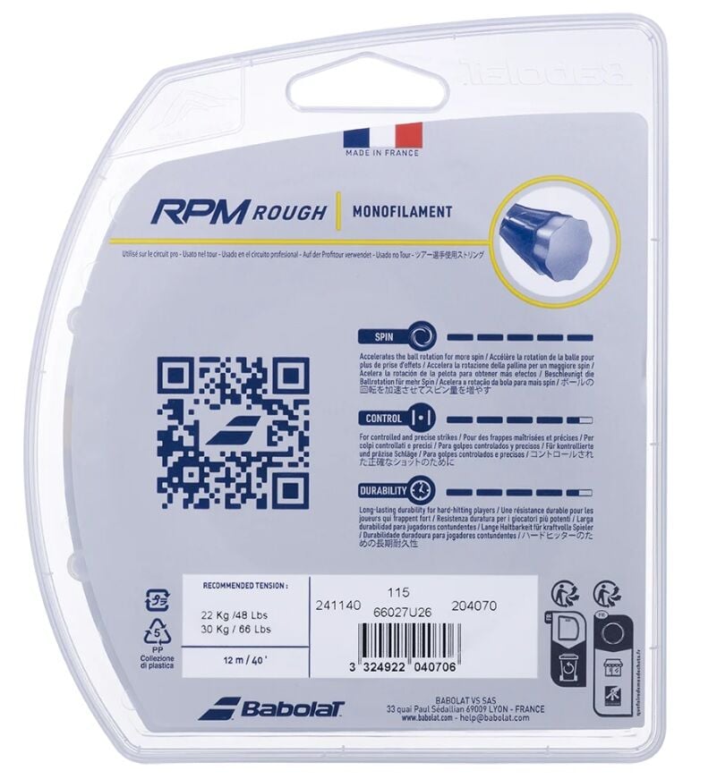 Dayanıklılık: RPM serisindeki kopolyester, monofilament telleri özellikle dayanıklı hale getirir. Bu, topa sert vuran oyuncular için mükemmeldir. Kabartmalı logo, sürtünmeyi daha da azaltarak tellerin daha uzun süre dayanmasını sağlar.