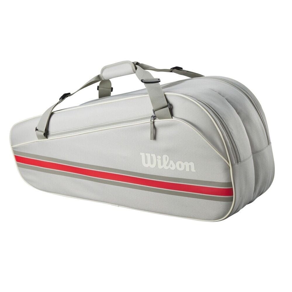 Ekstra ekipman taşımak isteyen kulüp oyuncuları için harika bir çanta olan Wilson'ın en yeni Team 6-Pack modeli, altı adede kadar tenis raketi, giysi ve diğer tenis malzemeleri için yer sunar. İki ana raket bölmesinin yanı sıra, ekstra toplar, tutacaklar ve kişisel eşyaları saklamak için büyük bir dış fermuarlı cep bulunur. Dayanıklı polyesterden üretilmiş olup, rahat taşıma için üst tutma sapı ve ayarlanabilir omuz askıları ile donatılmıştır.